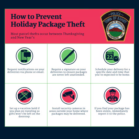 The Ashby Police Department wishes to share the following tips from the National Neighborhood Watch to help prevent package theft: